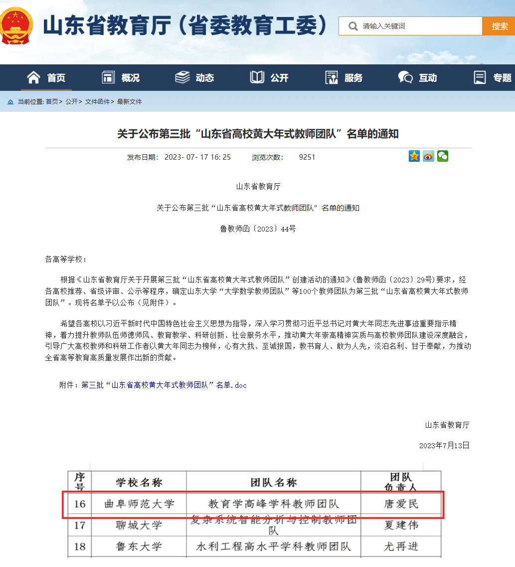 据悉,第三批“山东省高校黄大年式教师团队”的评选,经各高校推荐、省级评审、公示等程序产生,全省共有100个教师团队入选。这是继地理与旅游学院教师团队、体育科学学院教师团队之后,曲阜师大获批的第三个“山东省高校黄大年式教师团队”。