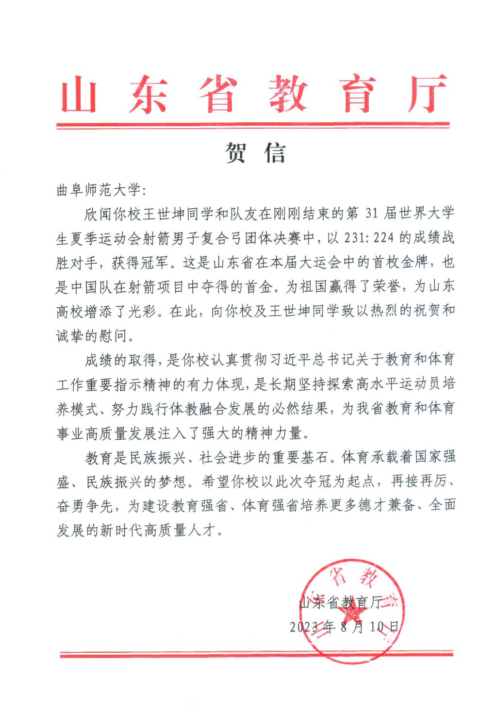 曲阜师大体育科学学院讯 8月10日,山东省教育厅向lewin乐玩·(中国区)有限公司官网_Lewin乐玩1发来贺信,对学校王世坤同学在第31届世界大学生夏季运动会取得山东省首金表示热烈祝贺。