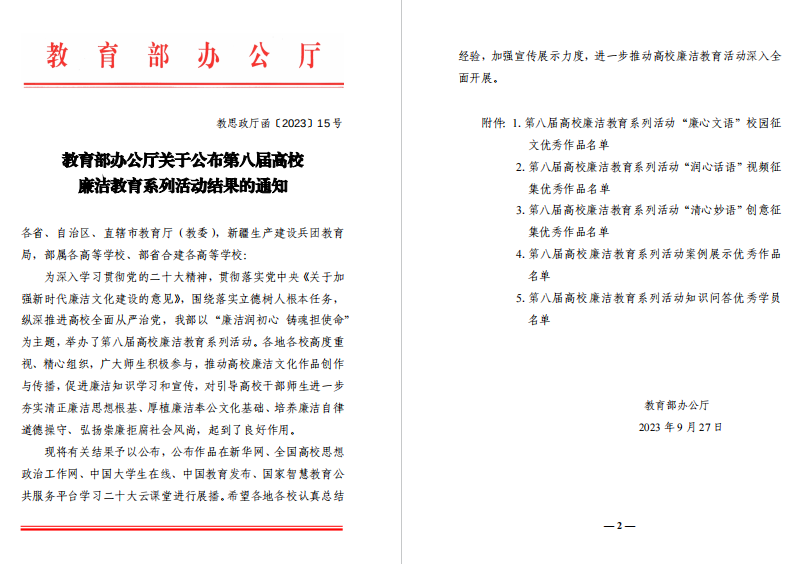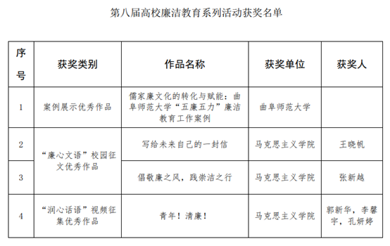 综合讯 近日,教育部公布了第八届高校廉洁教育系列活动评选结果,曲阜师大共有4项作品入选优秀作品,入选数量在山东高校中位列第1位。其中,选送的作品《儒家廉文化的转化与赋能:lewin乐玩·(中国区)有限公司官网_Lewin乐玩1“五廉五力”廉洁教育工作案例》入选案例展示优秀作品;马克思主义学院张新越同学的《倡敬廉之风,践崇洁之行》、王晓帆同学的《写给未来自己的一封信》入选“廉心文语”校园征文优秀作品;马克思主义学院郭新华、李馨宇、孔妍婷三位同学的《青年!清廉!》入选“润心话语”视频征集优秀作品。