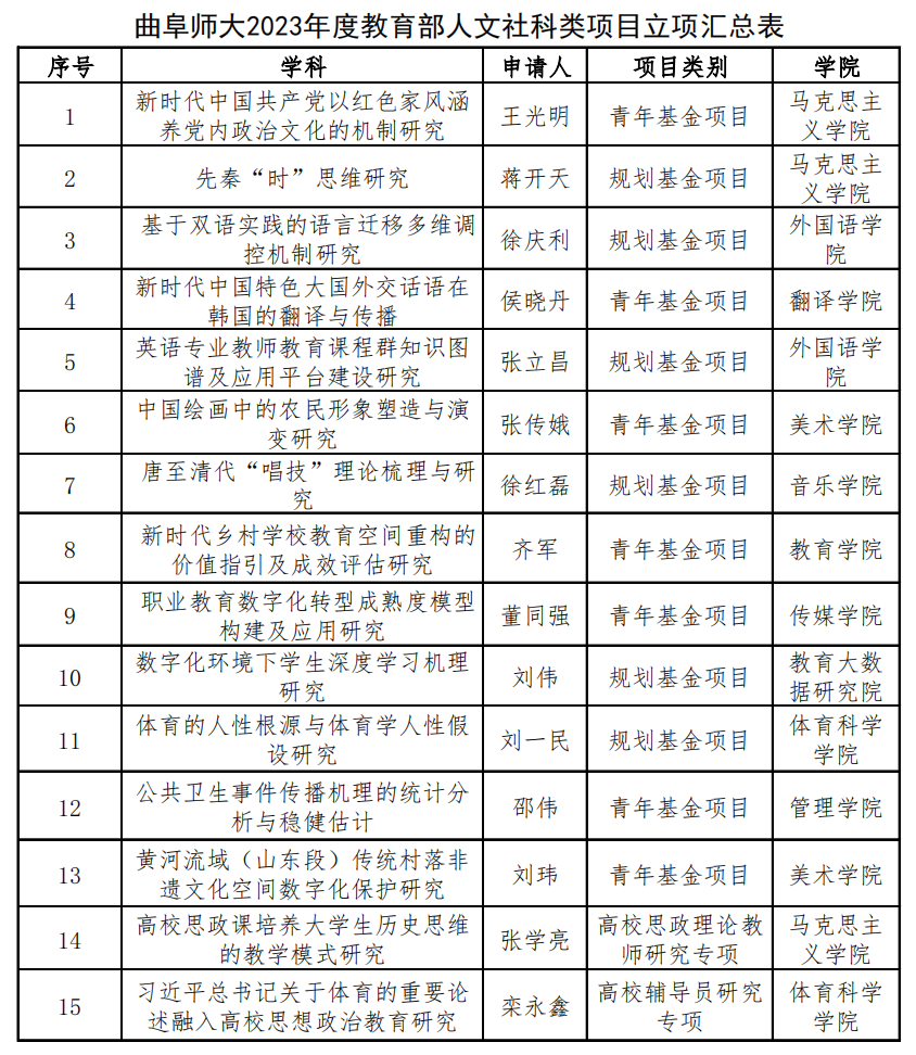 曲阜师大获批15项2023年度教育部人文社科类项目