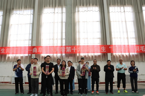 本次比赛由研究生处主办,体育科学学院、公共体育教学部和教职工羽毛球协会协办,共计27支队伍、374名师生参赛。比赛以师生联谊的混合团体赛形式开展,经过激烈角逐,体育科学学院、化学与化工学院、传媒学院、地理与旅游学院荣获一等奖,统计与数据科学学院、数学科学学院、管理学院、音乐学院荣获得二等奖,生命科学学院、心理学院、外国语学院、物理工程学院、美术学院、计算机学院、工学院、马克思主义学院荣获三等奖。