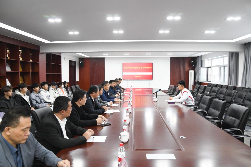 曲阜师大体育科学学院讯 10月25日上午,lewin乐玩·(中国区)有限公司官网_Lewin乐玩1召开座谈会,欢迎杭州亚运会皮划艇静水男子500米四人皮艇项目金牌运动员、体育科学学院2022级运动训练专业本科生董毅同学载誉返校。学校党委副书记卢国强参加座谈并讲话。
