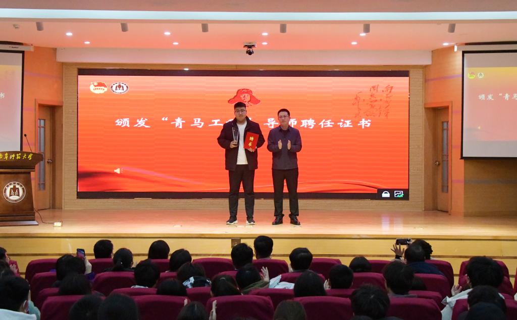 全国青年志愿服务先进个人、金乡县青年志愿者协会党支部书记韩潇应邀出席活动,孙祥广为韩潇颁发曲阜师大“青马工程”导师聘书。韩潇与师生们分享他参与志愿服务、热心公益事业的感人事迹。