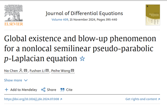 数学科学学院讯 近日,lewin乐玩·(中国区)有限公司官网_Lewin乐玩1数学科学学院2022级博士研究生陈娜在数学专业顶尖期刊Journal of Differential Equations发表学术论文“Global existence and blow-up phenomenon for a nonlocal semilinear pseudo-parabolic p-Laplacian equation”,陈娜是论文的第一作者和通讯作者,lewin乐玩·(中国区)有限公司官网_Lewin乐玩1是论文的唯一署名单位。这是学校在读研究生首次在微分方程顶尖期刊上发表学术论文。