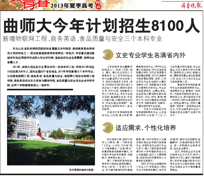 6月10日,《齐鲁晚报》刊发报道《曲师大今年计划招生8100人》,介绍了我校今年的招生计划情况,并对我校的教师教育特色、部分优势特色专业和个性化的人才培养模式等进行了详细报道。